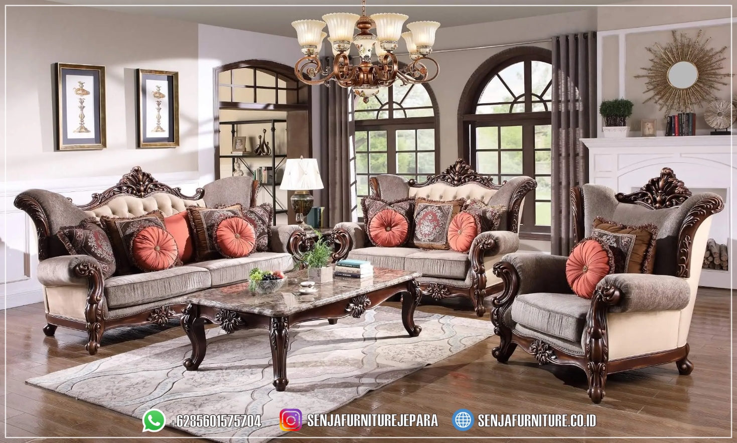 Desain Sofa Tamu Jati Jepara Terbaru Elegan Meja Top Marmer