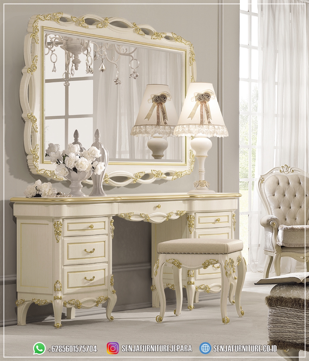 Kami mengundang Anda untuk merasakan kemewahan dan pesona dari Meja Rias Mewah kami yang mengagumkan. Tiap sentuhan, tiap detailnya disusun dengan keanggunan yang tak tertandingi, menciptakan suasana yang mewah dan menginspirasi di dalam ruang tidur Anda. Jadikanlah momen berdandan Anda menjadi istimewa dengan meja rias ini sebagai teman setia. Dari pagi hingga malam, nikmatilah keindahan yang tak terlupakan dari meja rias klasik kami, dan hadirkan kesempurnaan dalam setiap detiknya.